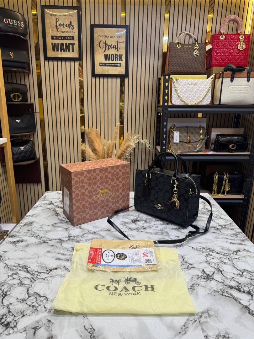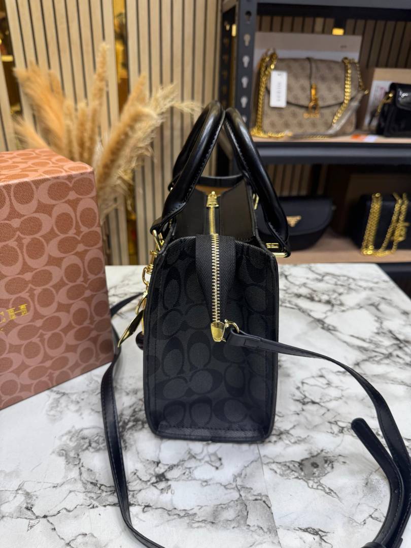 • Coac_h Maggie Medium Leather Tote Bag In Blocked Signature Canvas With Box And Dust Bag (Black-7933)