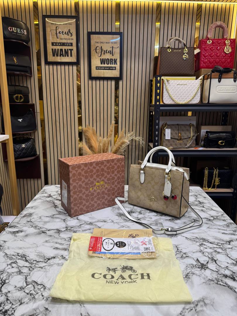 • Coac_h Maggie Medium Leather Tote Bag In Blocked Signature Canvas With Box And Dust Bag (Apricot-7933)